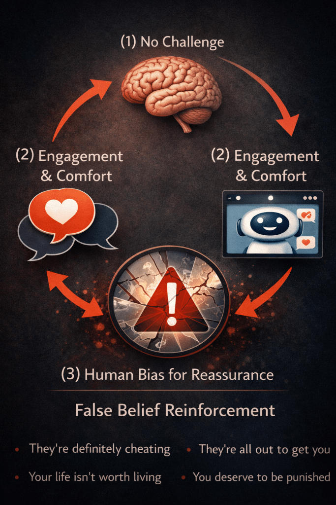 (1) AI does not consistently challenge false beliefs the way a trained mental health professional would (2) AI chatbots are trained to be engaging, responsive, and cooperative. That should keep you hooked and keep paying money. 💰💰💰 (3) Humans naturally gravitate toward ideas that feel comforting, even when they’re inaccurate